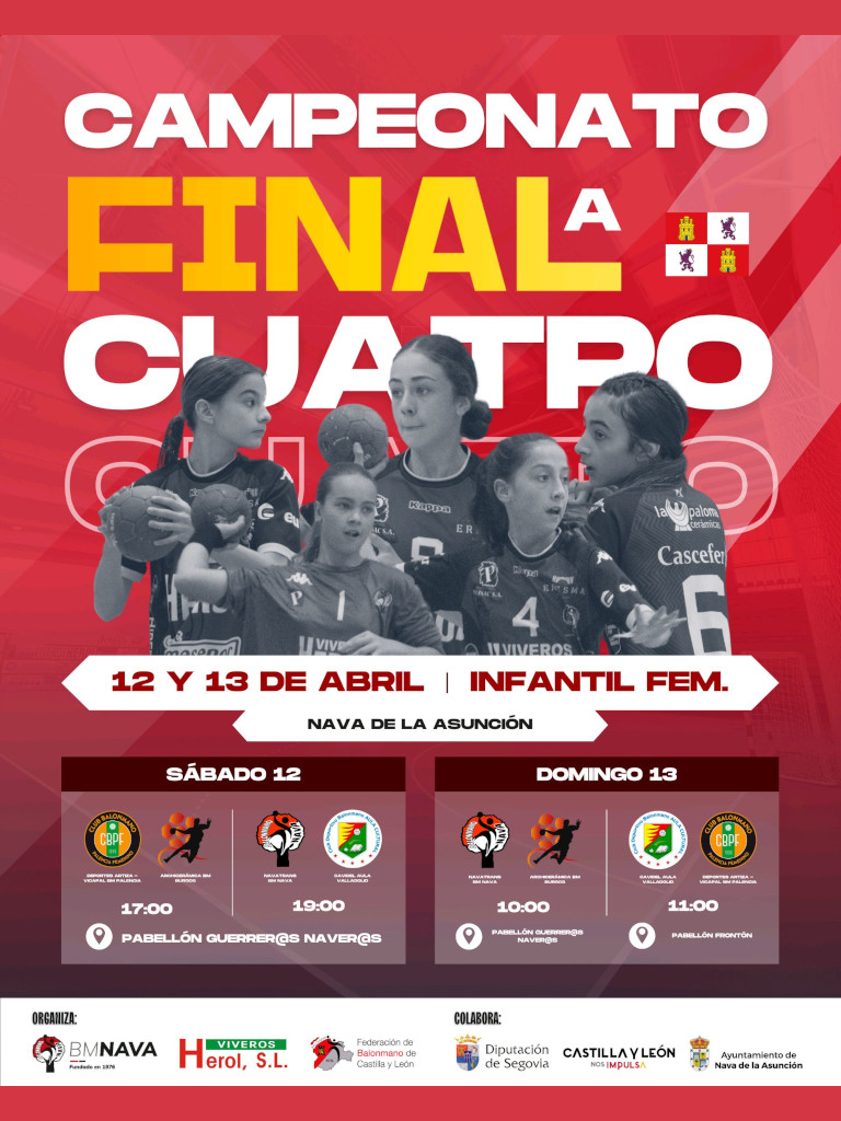 Este próximo sábado y domingo, en Nava de la Asunción (Segovia), se citan DEPORTES ARTIZA VICAPAL BM PALENCIA, NAVATRANS BM NAVA, CAVIDEL AULA VALLADOLID y ARCHICERÁMICA BM BURGOS, los cuatro mejores conjuntos de la categoría infantil femenina, en la gran final de la temporada.