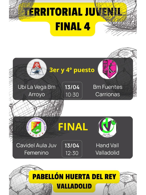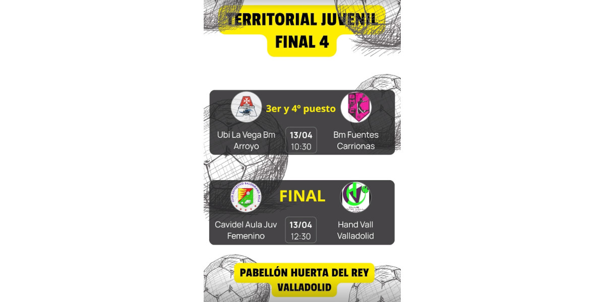 Este próximo sábado y domingo, en Valladolid, se citan HAND VALL VALLADOLID, CAVIDEL AULA JUV FEMENINO, UBI LA VEGA BM ARROYO y BM FUENTES CARRIONAS, los cuatro mejores conjuntos de la categoría juvenil femenina, en la fase final con la que culmina la temporada.