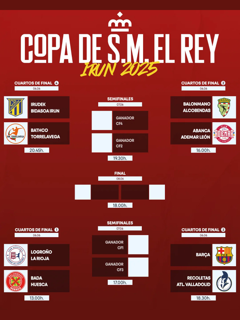IRUDEK BIDASOA IRÚN, como anfitrión, BATHCO TORRELAVEGA, BM LOGROÑO LA RIOJA, RECOLETAS ATLÉTICO VALLADOLID, BADA HUESCA, ABANCA ADEMAR LEÓN y BM ALCOBENDAS y BARÇA, como vigente campeón, buscarán el último trofeo de la temporada.