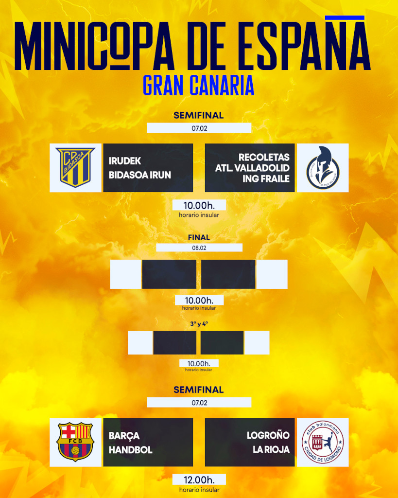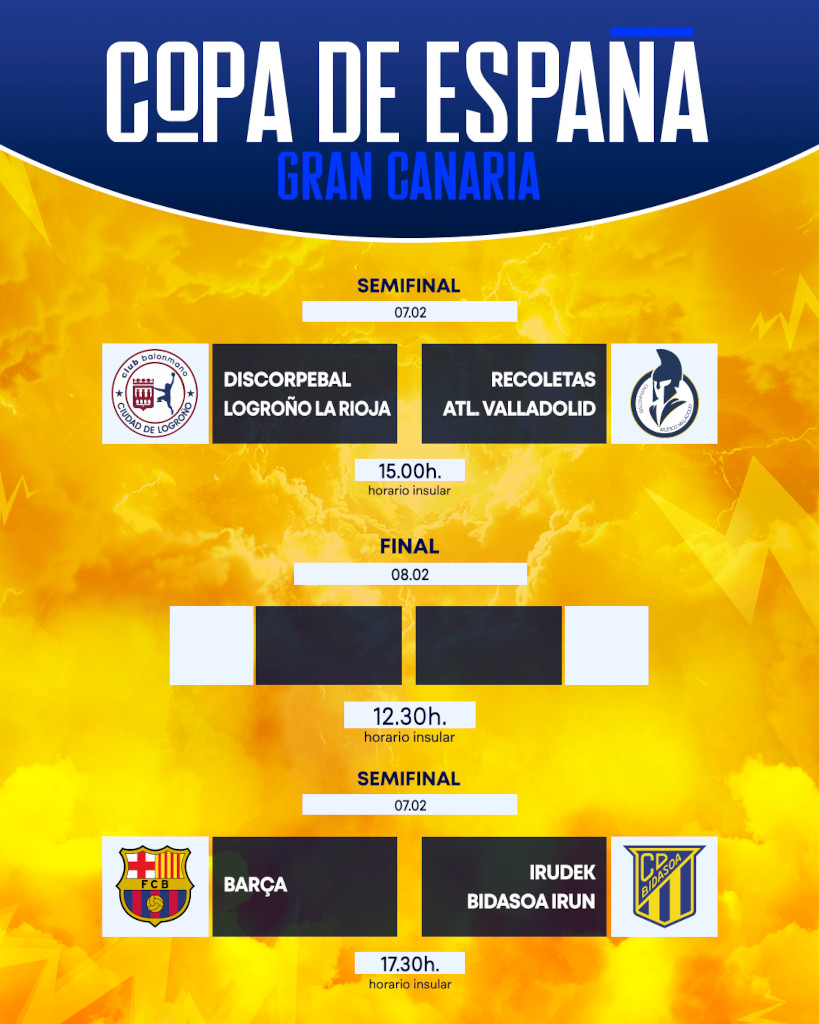 La Copa de España 2026 se juega este próximo fin de semana en el Pabellón Insular «Rita Hernández» (Telde, Gran Canaria) con la participación de los cuatro mejores equipos de la primera vuelta de la División de Honor Masculina (Liga NEXUS ENERGIA ASOBAL): BARÇA, IRUDEK BIDASOA IRÚN, RECOLETAS ATLÉTICO VALLADOLID y DICORPEBAL LOGROÑO LA RIOJA.