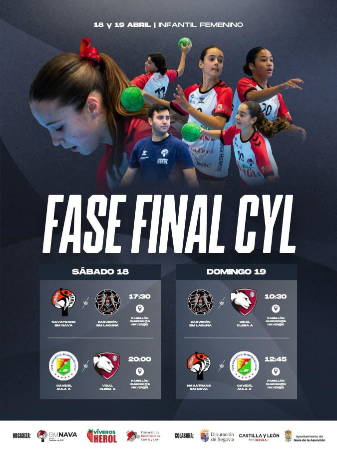 Este próximo fin de semana, días 18 y 19 de abril, tendrán lugar en Nava de la Asunción (Segovia) las jornadas 2 y 3 de la fase final infantil femenina de balonmano en Castilla y León. De ella participarán los equipos CAVIDEL AULA VALLADOLID A, ZASVISION BM LAGUNA, VIDAL CLEBA A y NAVATRANS BM NAVA, como anfitrión.
